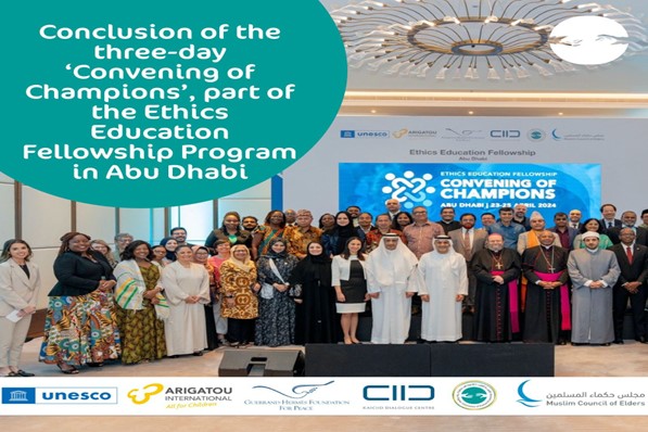 The capital of the United Arab Emirates, Abu Dhabi has hosted the ‘Convening of Champions’ as part of the Ethics Education Fellowship Program which is co-hosted by the Muslim Council of Elders, the Higher Committee of Human Fraternity, UNESCO, Arigatou International, KAICIID International Dialogue Centre and the Guerrand-Hermès Foundation for Peace with participation from the United Arab Emirates' Ministry of Education.